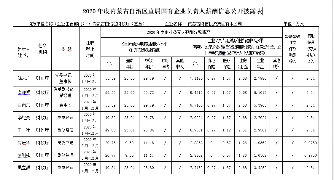 2020年度內蒙古自治區(qū)直屬國有企業(yè)負責人薪酬信息公開披露表