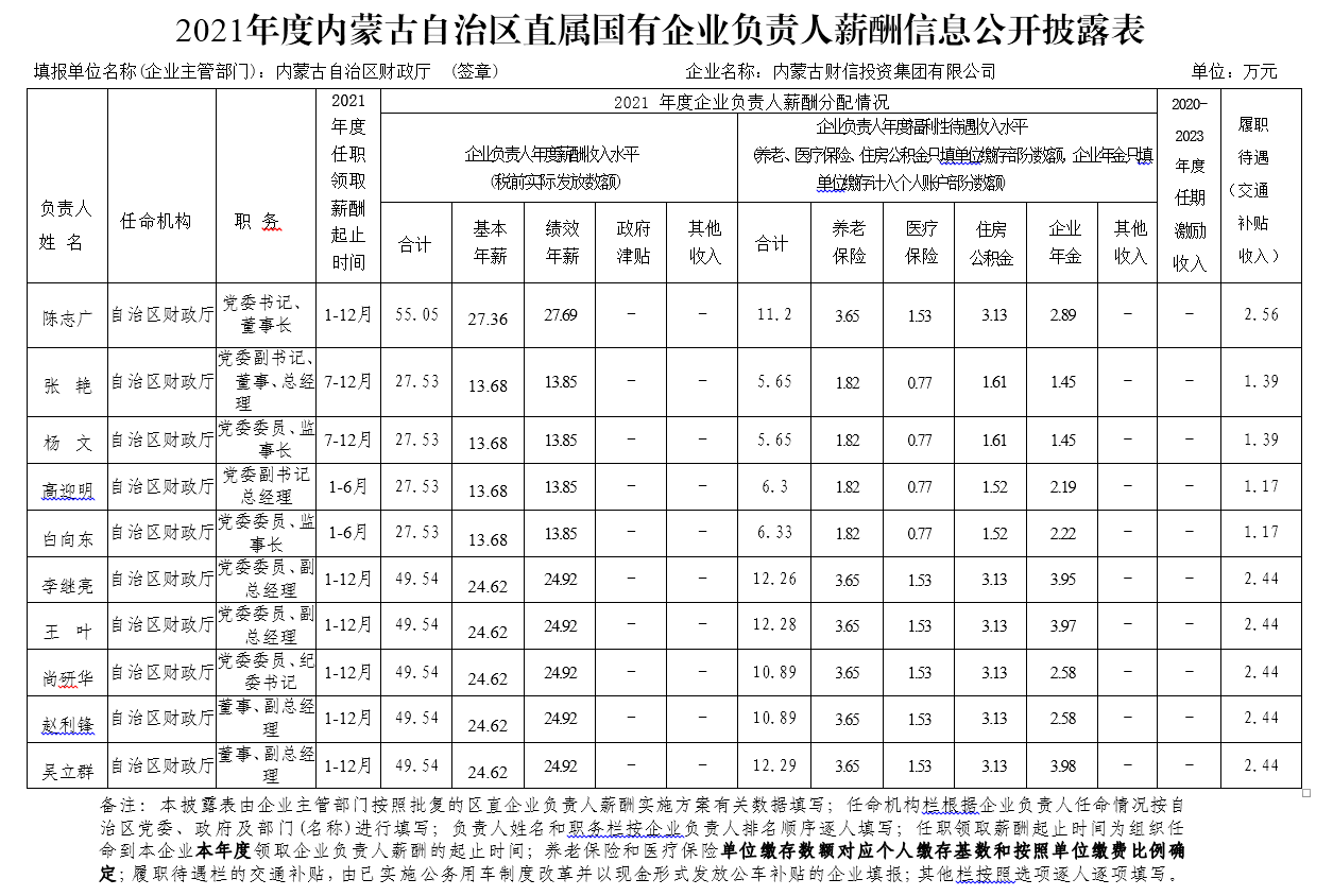 2021年度內蒙古自治區(qū)直屬國有企業(yè)負責人薪酬信息公開披露表